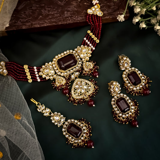 Shriya Kundan Choker Necklace Set - Maroon & Green