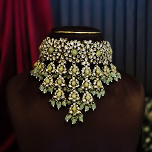 Shabana Premium Kundan Pearl Choker Necklace Set - Mint Green