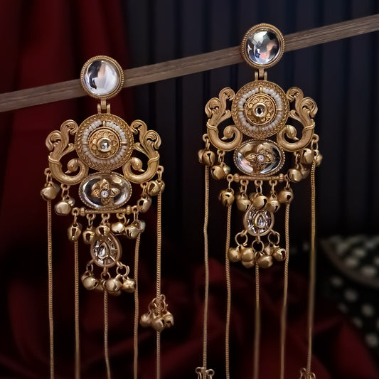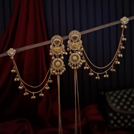 Husna Premium Kashmiri Brass Ghungroo Earrings with Sahara/Earchains - Golden