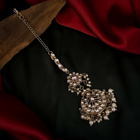 Jharna Kundan Pearl Chandbali Earrings with Teeka - Golden