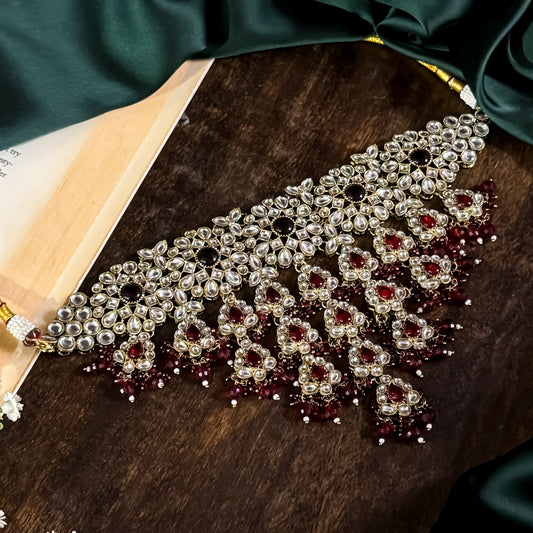 Shabana Premium Kundan Pearl Choker Necklace Set - Wine