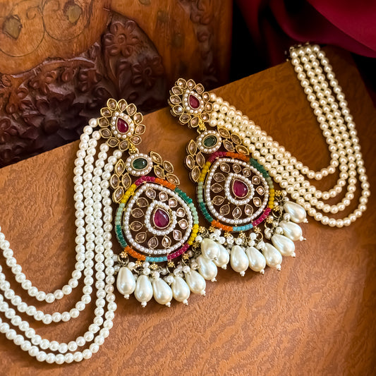Saira Pearl Peacock Chandbali Earrings with Sahara/Earchains