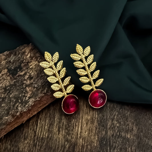 Lina Leaf Drop Handcrafted Brass Earrings - Maroon