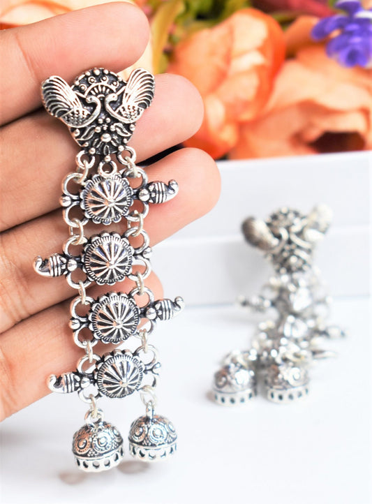 Peacock Embellished Multi Layer Oxidised Jhumka Earrings