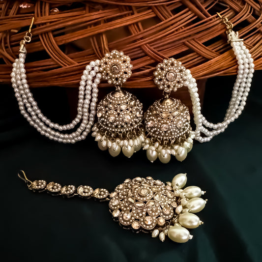 Mahtaab Jadau Reverse AD Jhumka Earrings with Earchain & Teeka - Golden