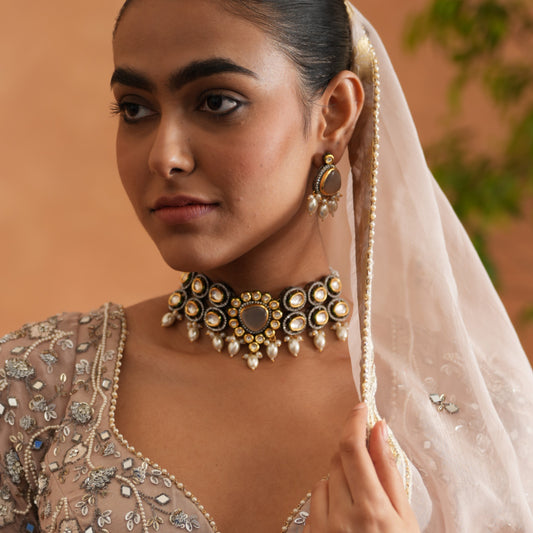 Meher Dabi Kundan Necklace Set- Golden