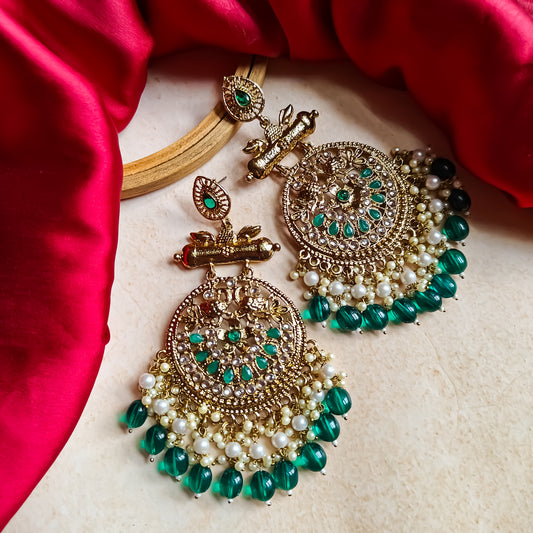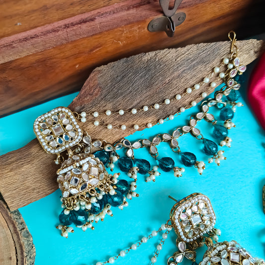Mohika Mirror Jhumka Earrings with Sahara & Tika Set - Peacock Blue
