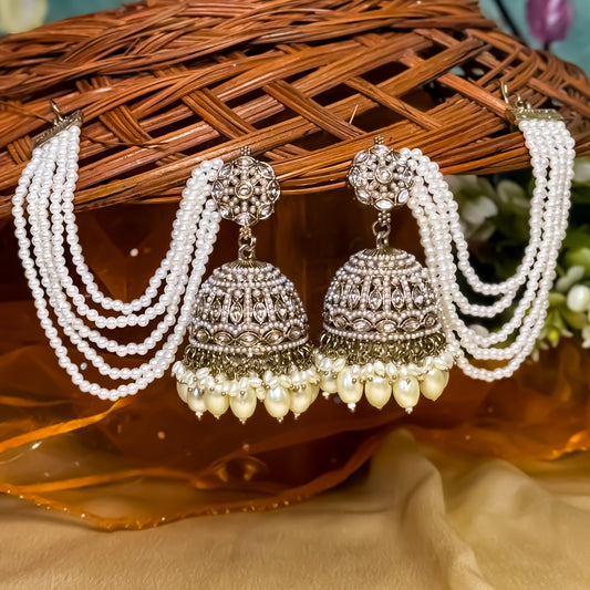 Mehvish Jadau Reverse AD Jhumka Earrings with Earchain - Golden
