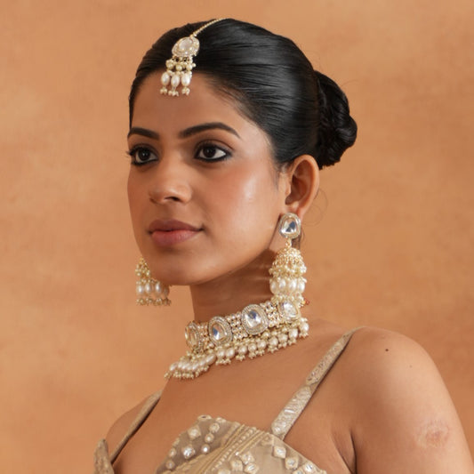 Kanika Jadau (Reverse AD)Chandbali Sahara Earrings & Mangtika Set - Ivory/Golden