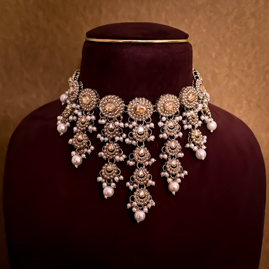Noorani Reverse AD Necklace Set with Jhumka Sahara Earrings & Teeka - Golden