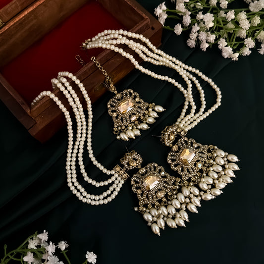 Jodha Jadau Reverse AD Necklace Set with Sahara Earrings & Teeka - Golden