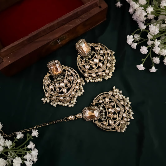 Mahtaab Jadau Reverse AD Jhumka Earrings with Earchain & Teeka - Golden
