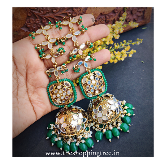 Rushda Jadau Mirror Jhumka Earrings with Sahara/Earchains - Golden