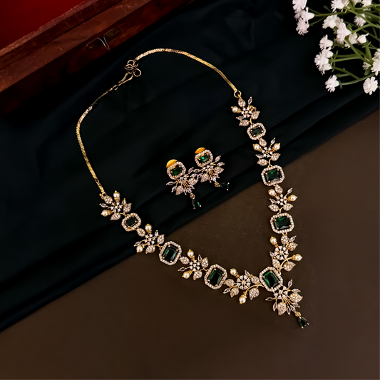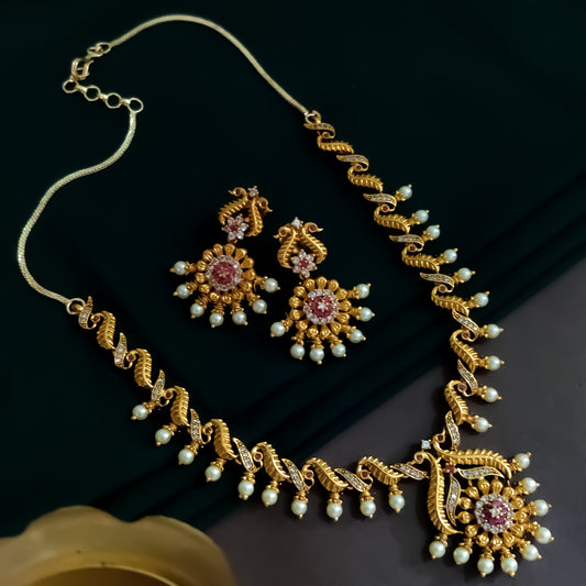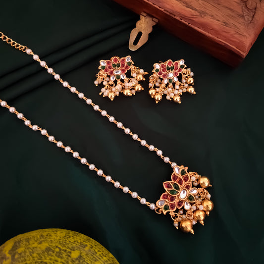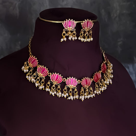 Nalini Lotus Temple Motif Necklace Set - Pink & Green
