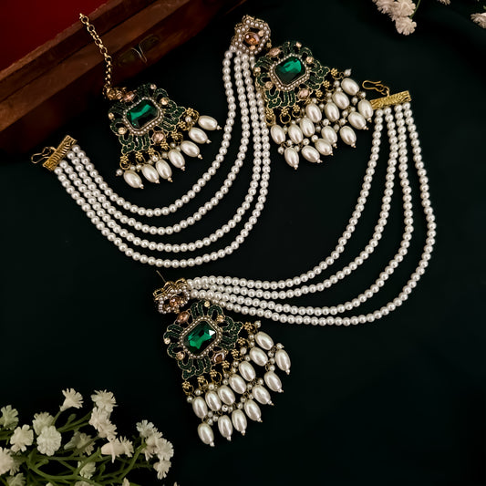 Jodha Jadau Reverse AD Necklace Set with Sahara Earrings & Teeka - Green