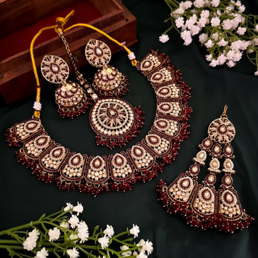 Sahana Jadau Preminum Reverse AD Ganthan Necklace Set with Teeka & Pasha - Maroon