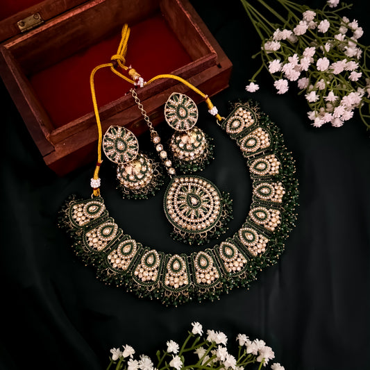 Sahana Jadau Preminum Reverse AD Gantnan Necklace Set with Teeka & Pasha - Green