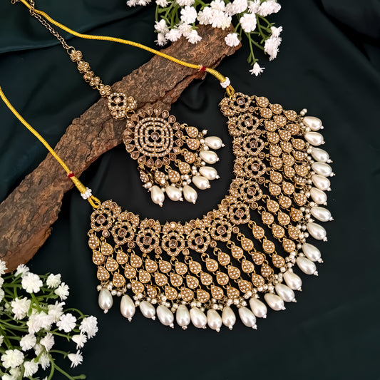 Mishka Jadau Reverse AD Sleek Golden Necklace Set with Earrings & Teeka