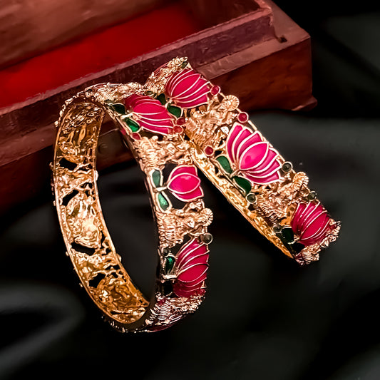 Nalini Lotus Lakshmi Temple Gold Bangles - Set of 2 (Pink)