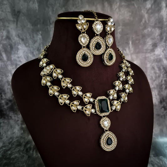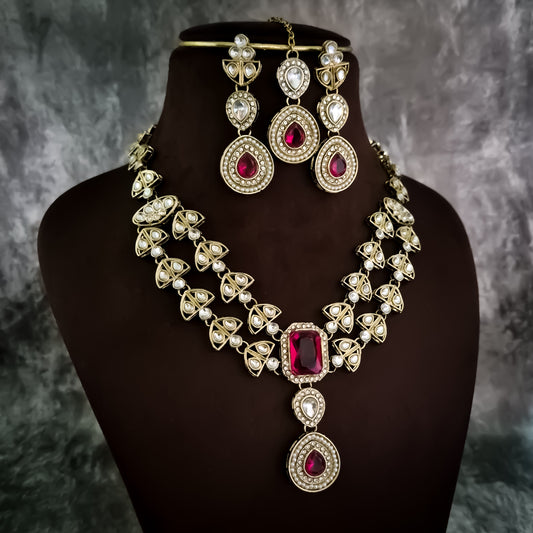 Jennifer Double Layer AD Necklace Set - Hot Pink