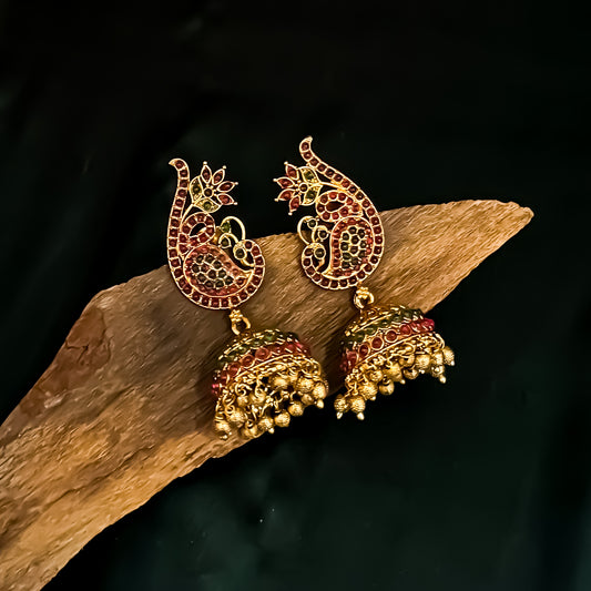 Sreedha Temple Gold Jhumka Earrings - Maroon & Green
