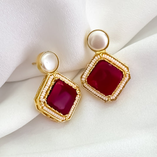 Viren Monalisa Stone Premium Brass Stud Earrings - Maroon
