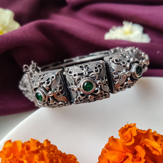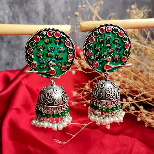 Peacock Zircon Hand-Painted SLA Jhumka Earrings - Green & White