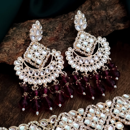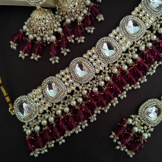Sahana Jadau Preminum Reverse AD Gantnan Necklace Set with Teeka & Pasha - Wine