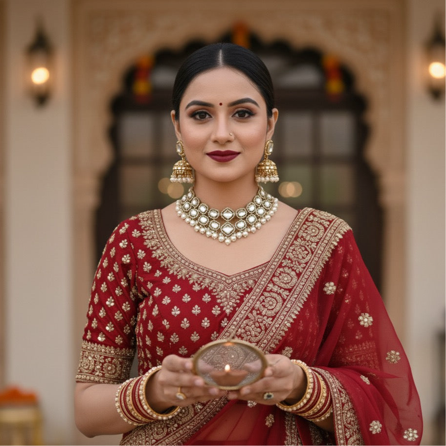 Aaliyah Polki Look-Alike Double Layer Necklace Set – A statement blend of tradition and elegance. Featuring a stunning double-layer design with intricate polki look-alike detailing, this set adds regal charm to any festive or wedding outfit. Comes with matching earrings for a complete look.
