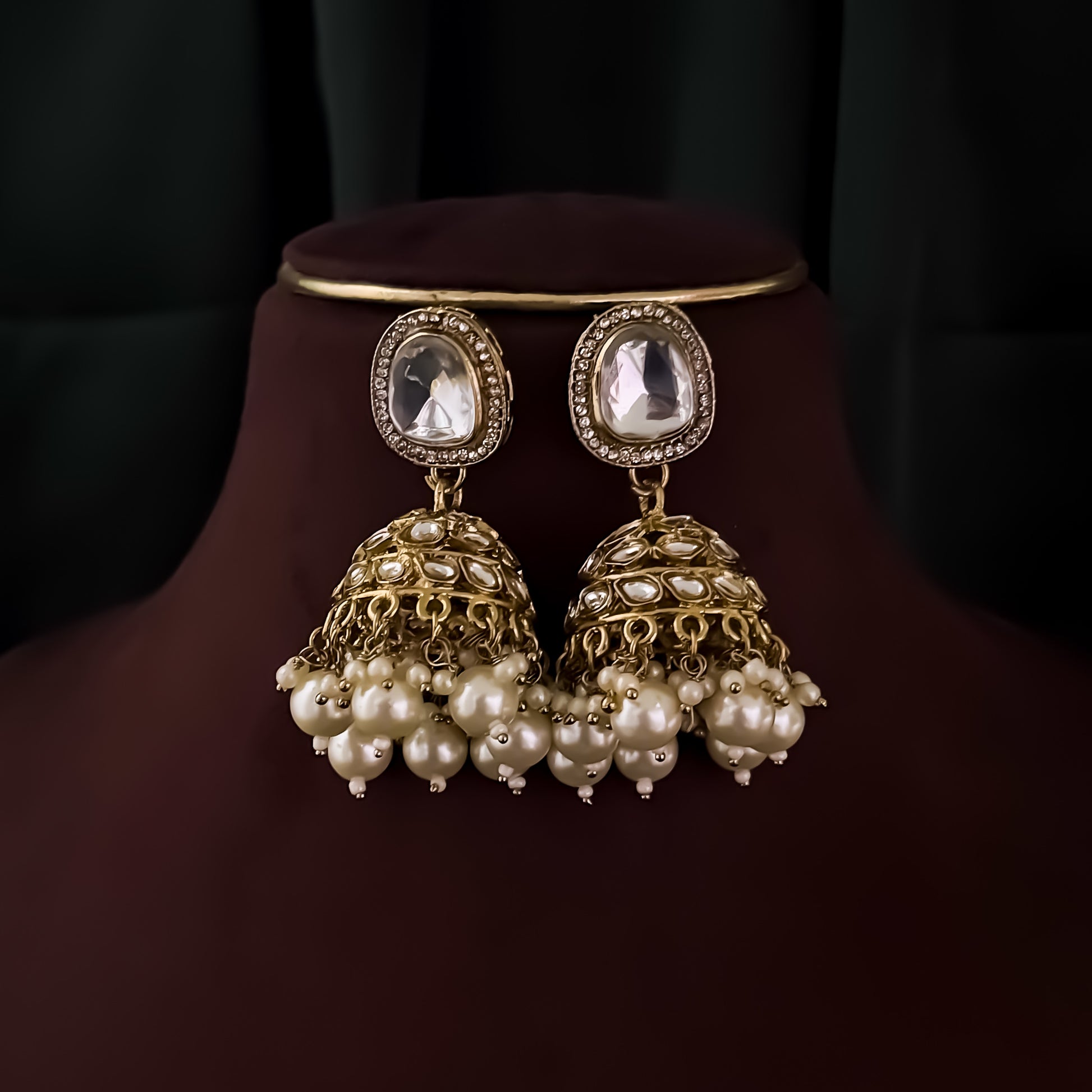 Rushda Jadau Mirror Jhumka Earrings with Sahara/Earchains - Golden