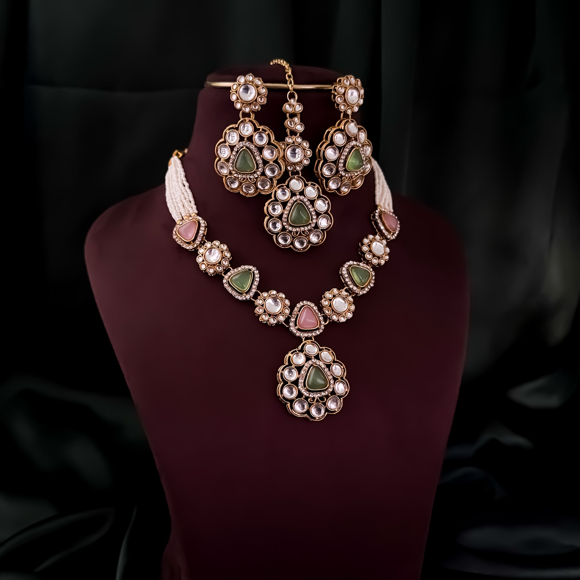Anjani Kundan Pendant Necklace Set - Pastel Pink & Pastel Green