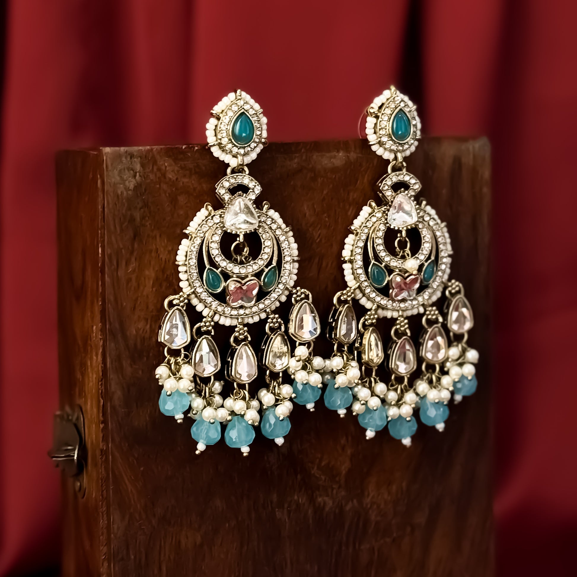 Athiya Kundan Pearl Premium Chandbali Earrings - Sky Blue/Firozi