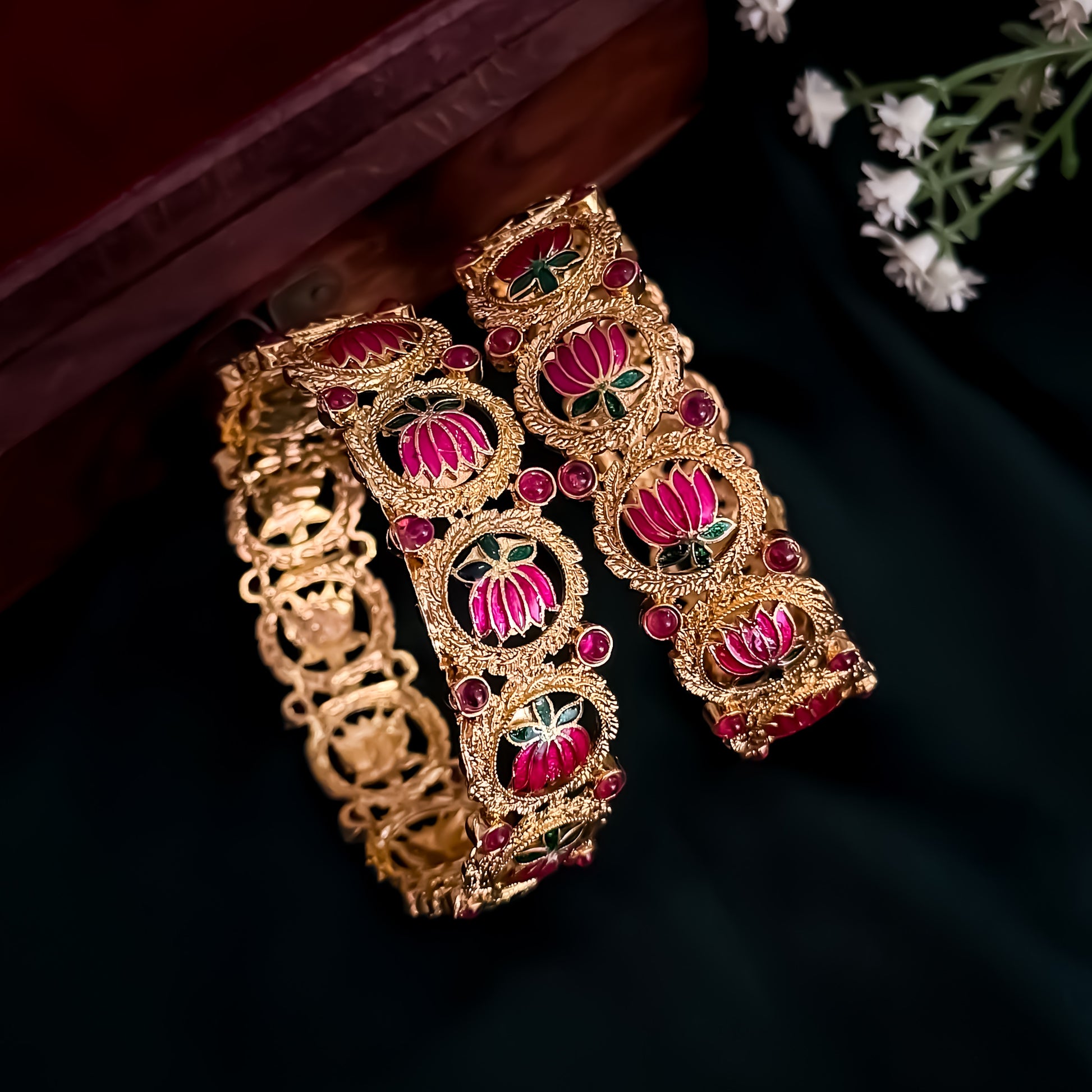 Kamalika Temple Gold Bangles - Set of 2 (Pink & Green)
