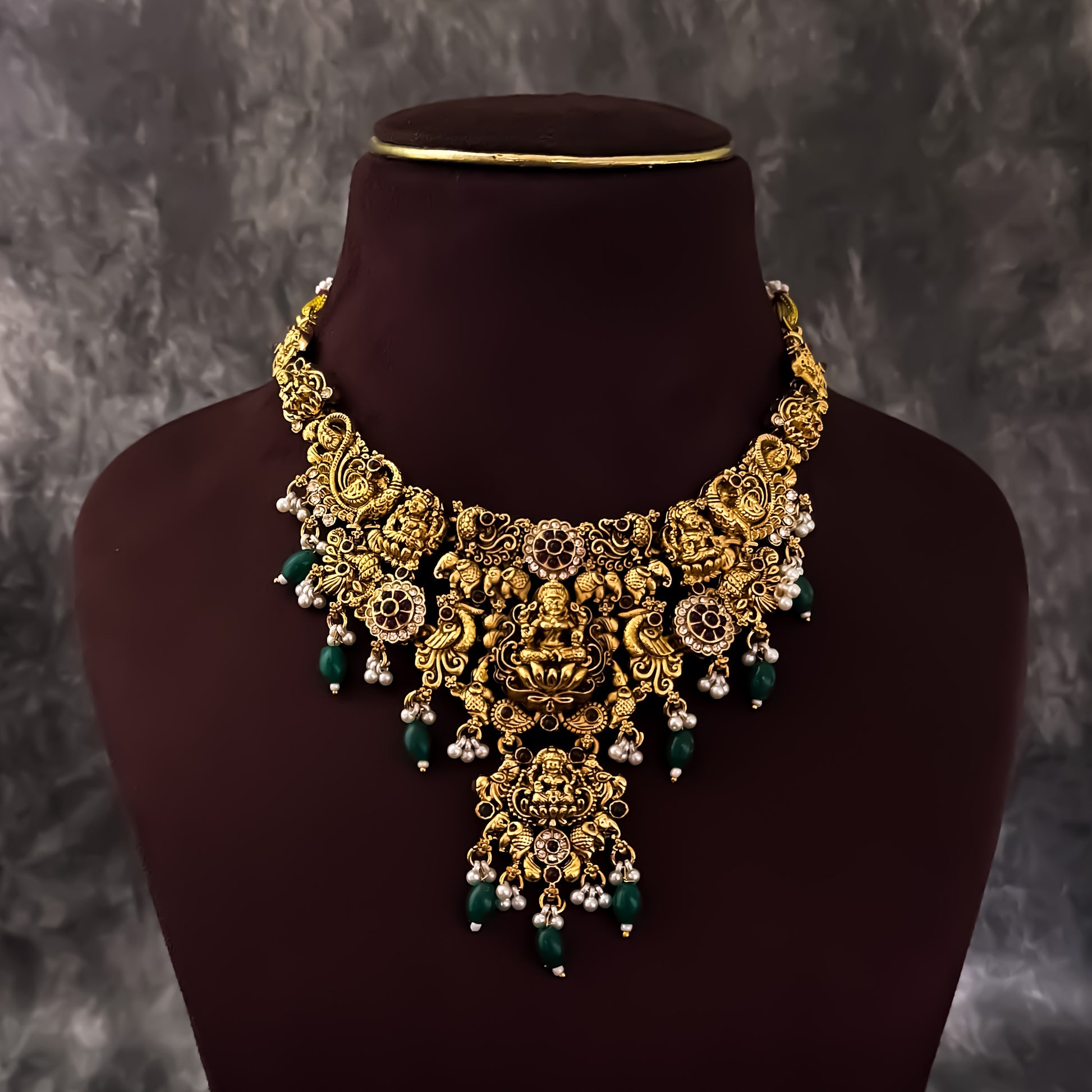 A regal temple necklace set featuring intricate golden detailing with striking green accents. Perfect for weddings, festive occasions, and traditional ensembles, this timeless piece adds elegance and divine charm to your look.