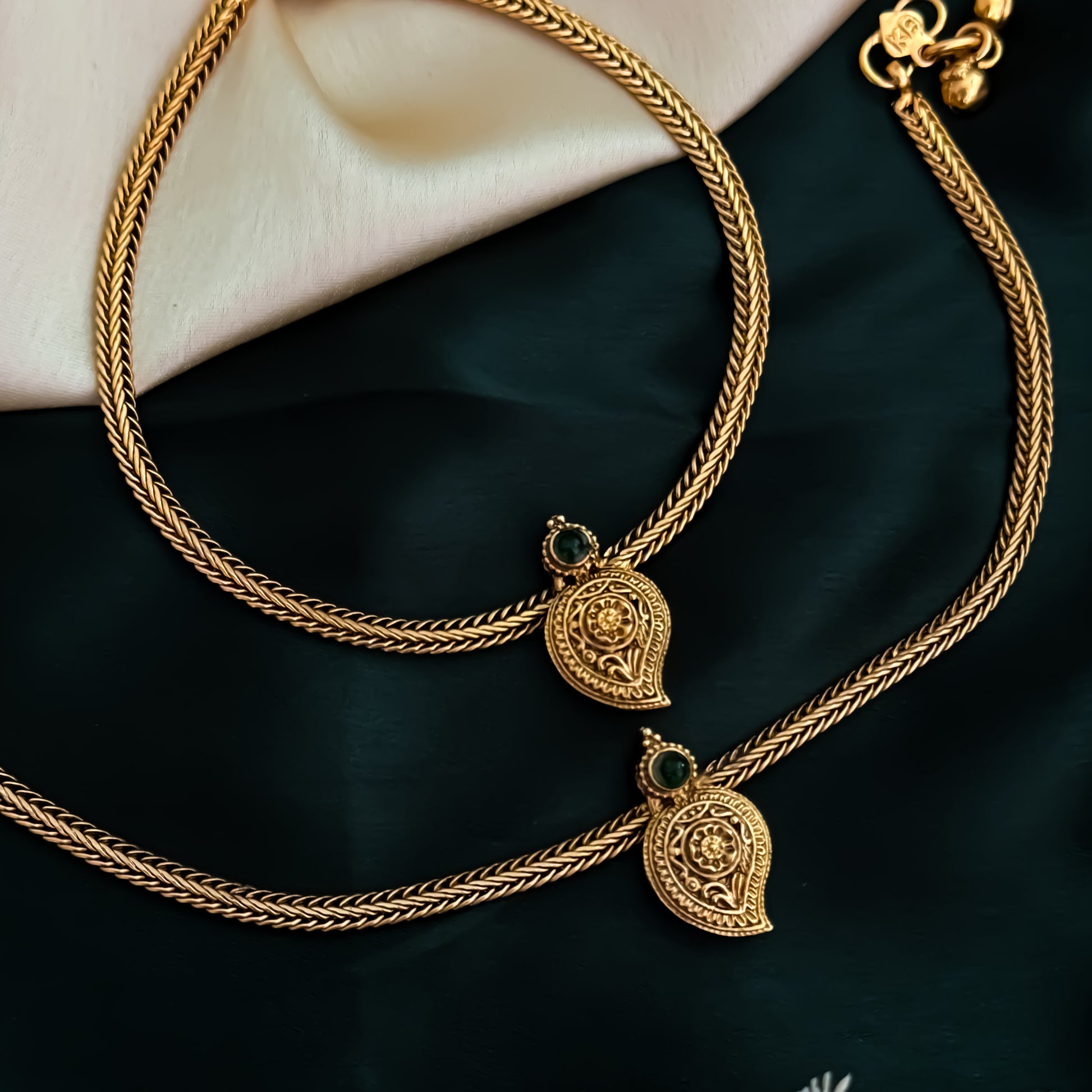 Radiating the charm of timeless traditions, our Golden Temple Anklet is a graceful blend of heritage and elegance. Inspired by temple jewelry artistry, this anklet features intricate detailing reminiscent of South Indian craftsmanship, making it a perfect piece to elevate festive and traditional looks.
