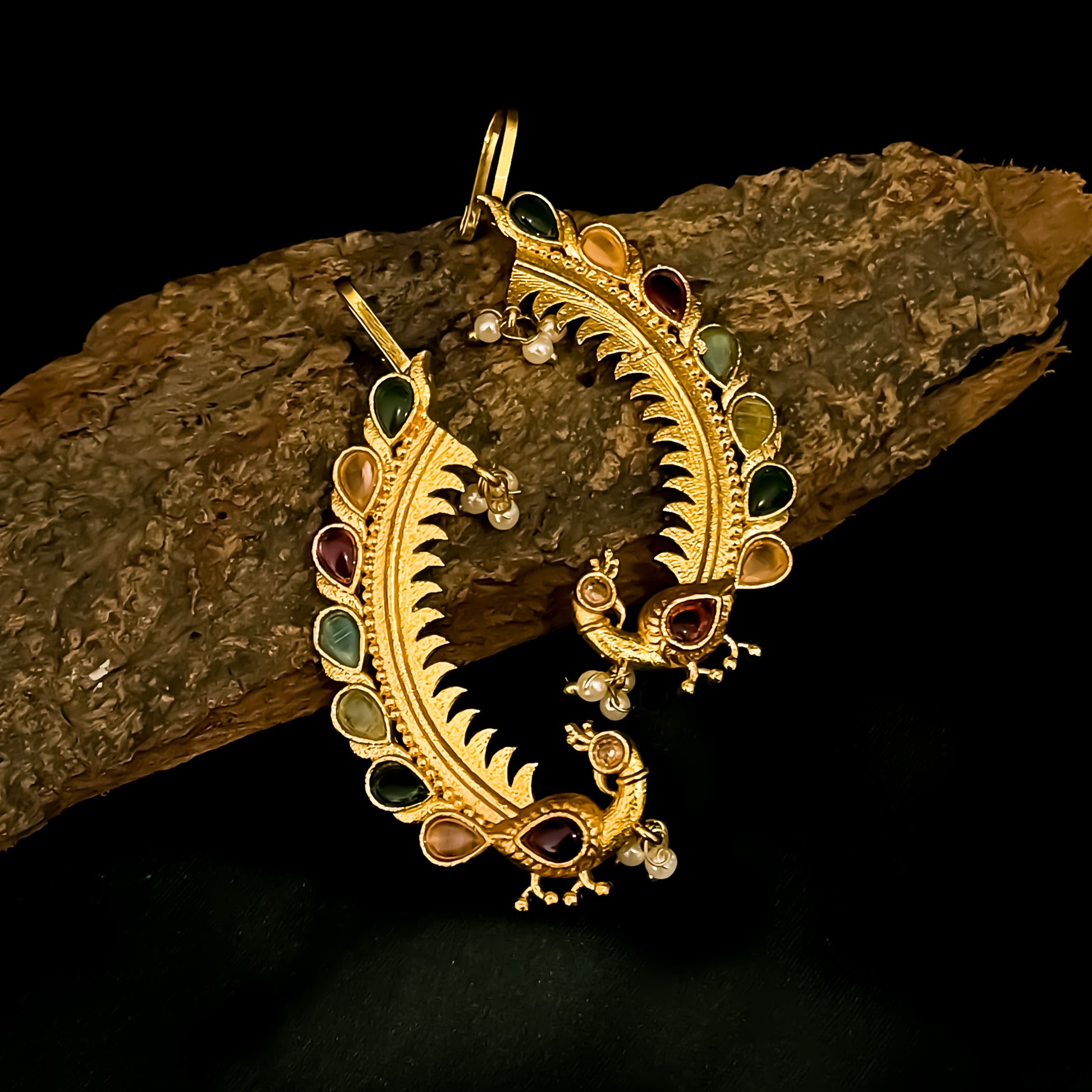Mayurkanchi Peacock Premium Kashmiri Brass Jhumka with Earcuff Earrings - Golden