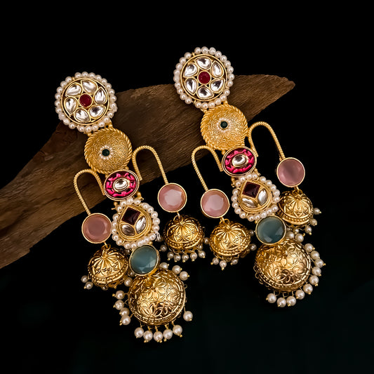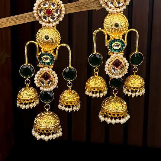 Manika Jadau Jhumka Earrings with Sahara/Earchains - Golden