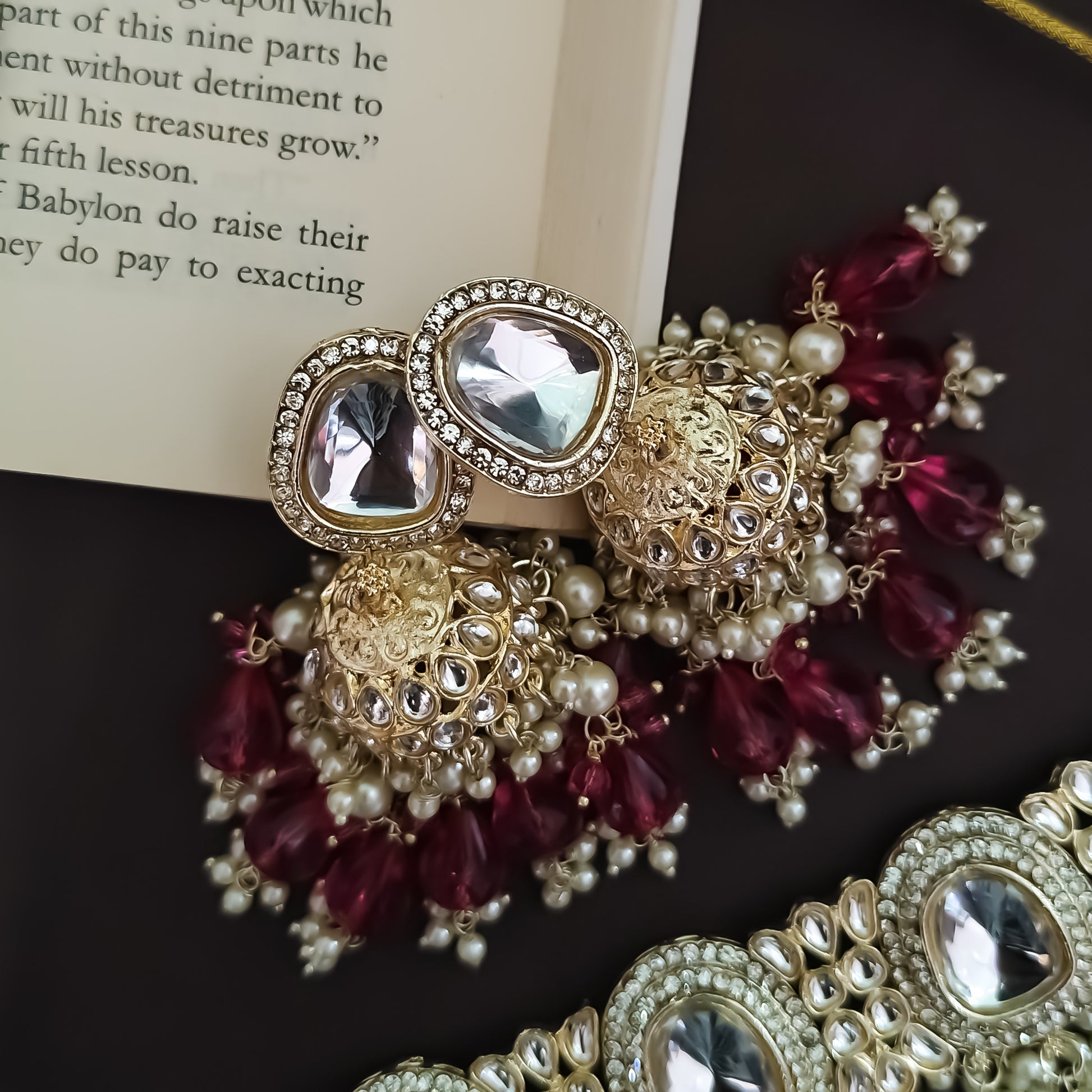 Rushda Jadau Mirror Jhumka Earrings with Sahara/Earchains - Golden