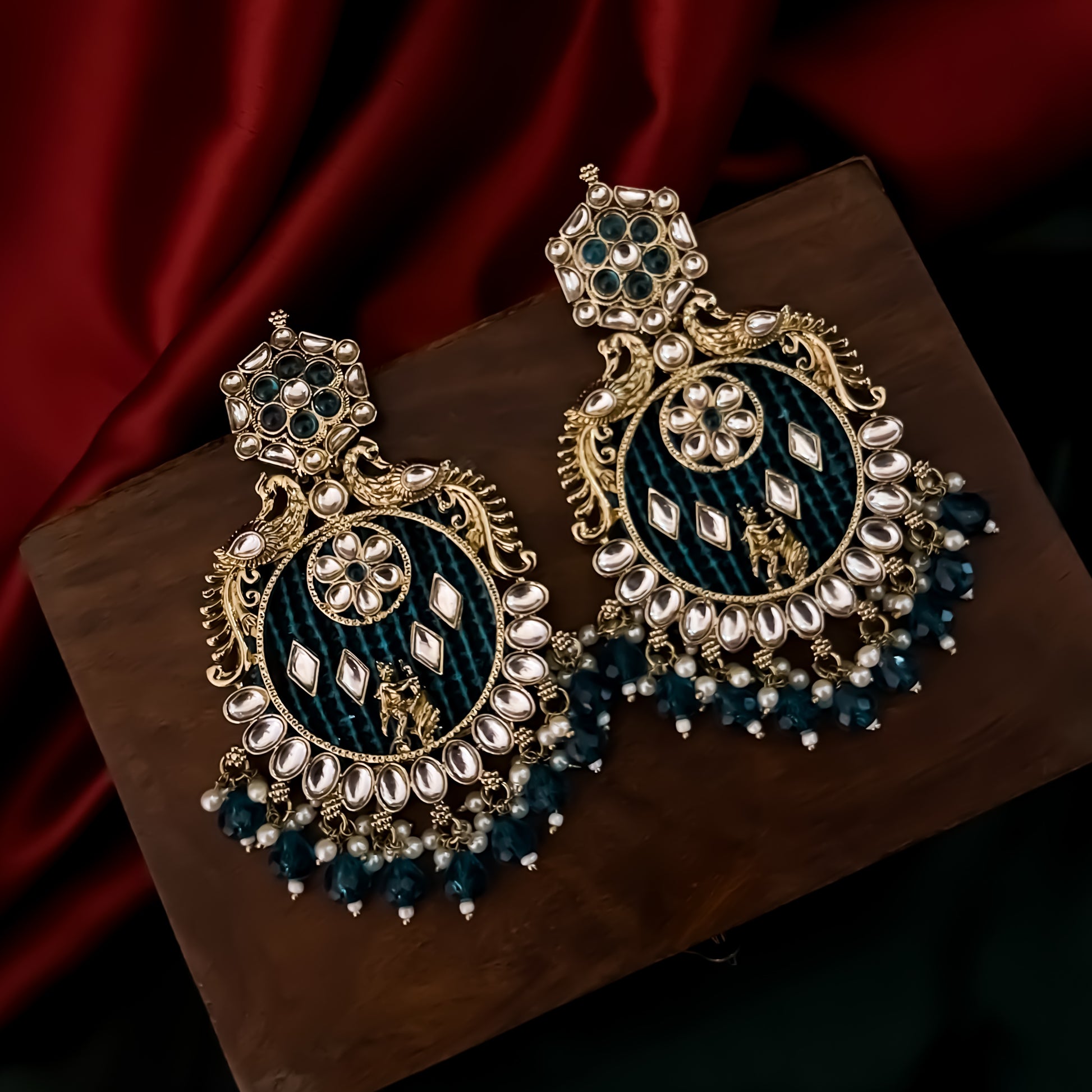 Mandana Kundan Chandbali Earrings - Peacock Blue