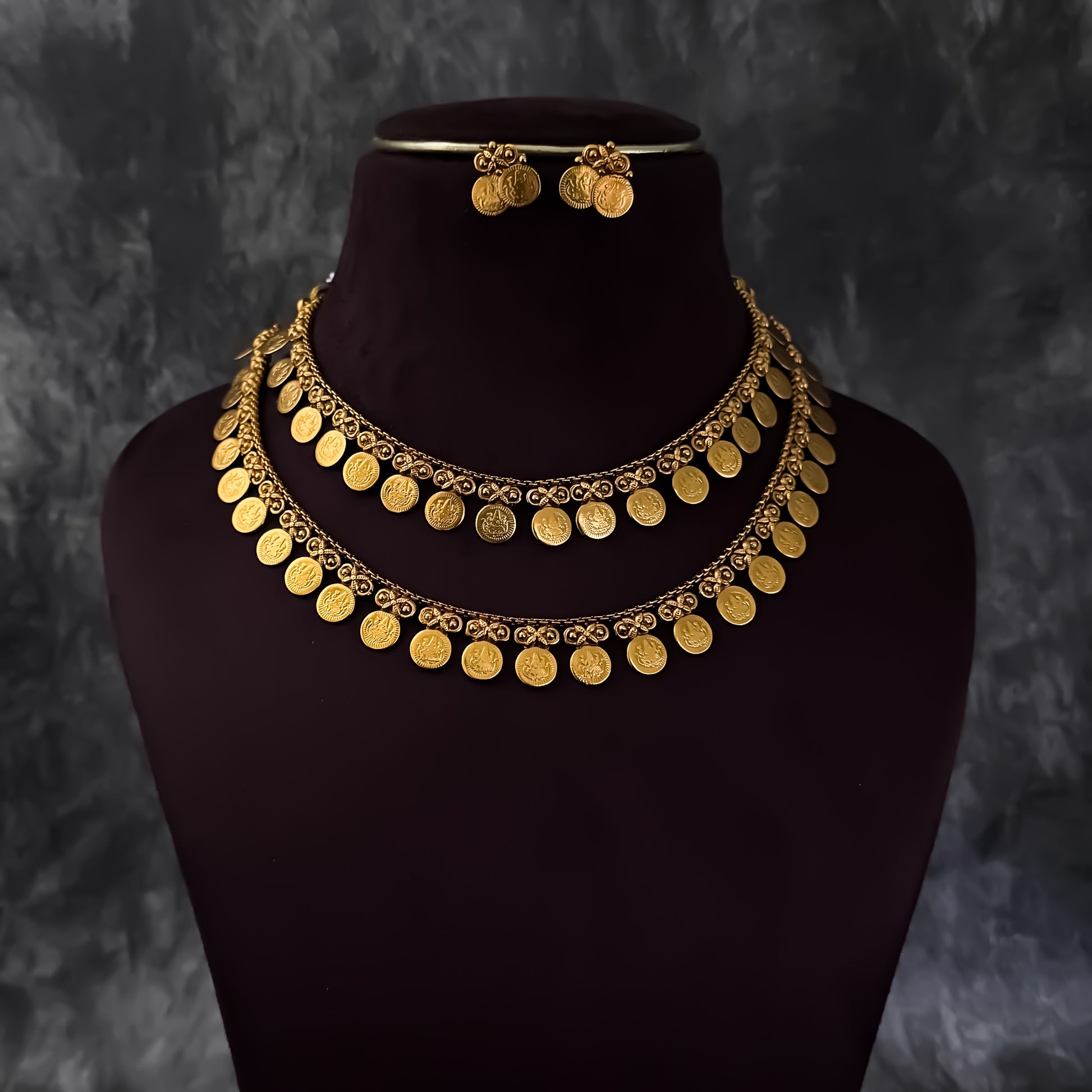 A timeless South Indian classic, this Double Layer Kashumala Golden Necklace Set features intricately crafted coins with goddess motifs, symbolizing prosperity and tradition. Perfect for weddings, festivals, and cultural celebrations, it beautifully blends elegance with heritage. Comes with matching earrings for a complete look.