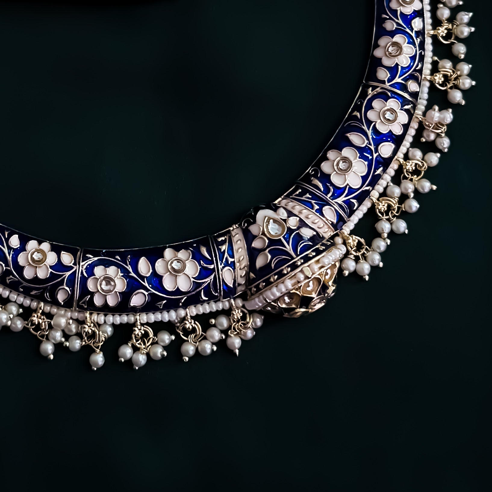The Drishti Meenakari Hasli Necklace Set is a stunning blend of traditional elegance and vibrant craftsmanship. Featuring intricate meenakari work, this hasli-style necklace exudes regal charm with its bold, curved design. Perfect for adding a touch of heritage to any outfit, it comes with matching earrings, making it an ideal choice for festive occasions or special events.