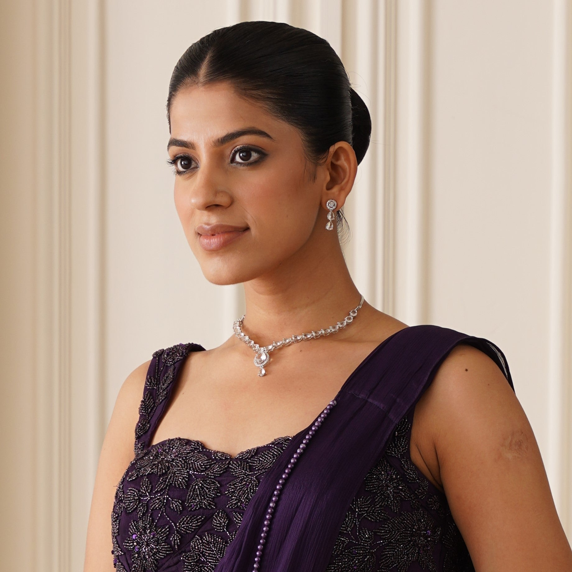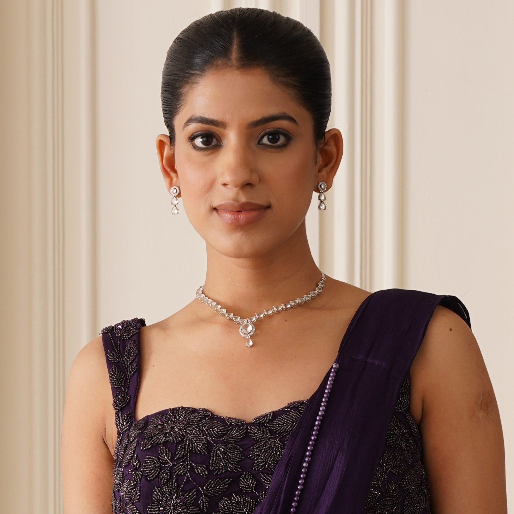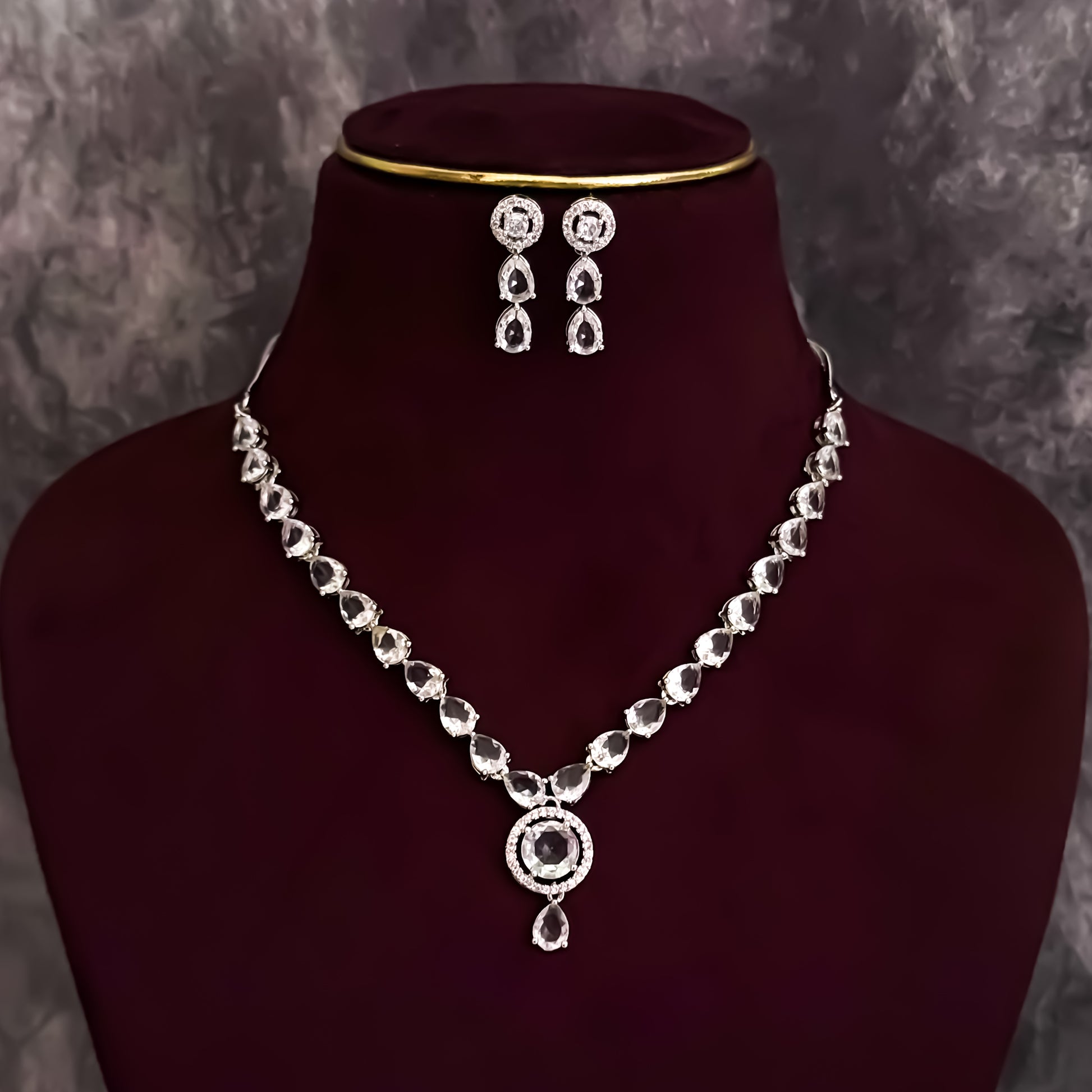 The Eloise American Diamond Necklace Set features a stunning design with sparkling American diamonds, meticulously arranged to create a sophisticated and elegant look. Ideal for special occasions, this set combines timeless beauty with contemporary charm, adding a touch of glamour to any ensemble.
