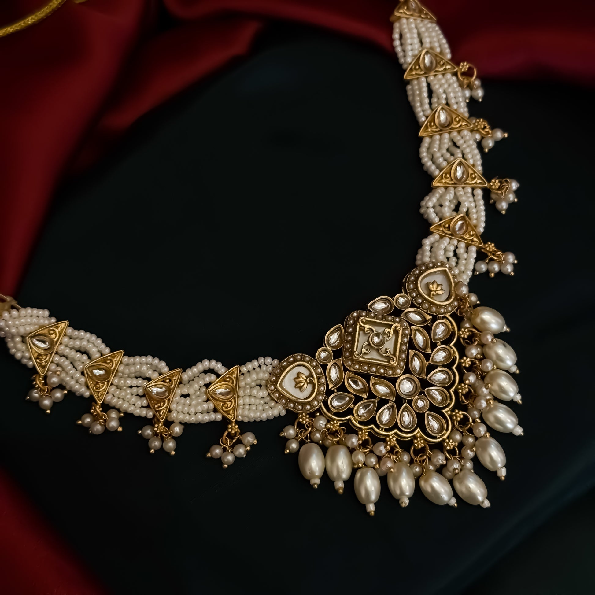Step into royal elegance with our Gauhar Rajwadi Matte Polish Necklace Set, a masterpiece that captures the grandeur of traditional Indian artistry. Crafted in a rich golden matte finish, this set exudes a regal charm that feels timeless and effortlessly luxurious.