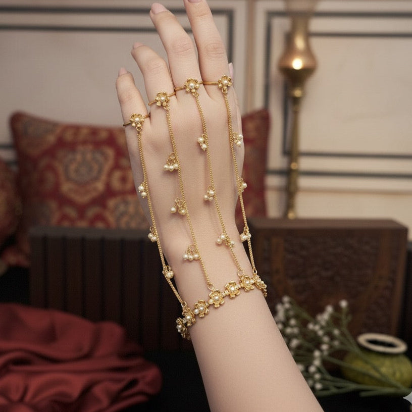 Designed with delicate ghungroos that create a subtle musical tinkle with every movement, it wraps gracefully around your wrist and fingers—making it the perfect statement accessory for weddings, sangeet, mehendi, and festive celebrations.