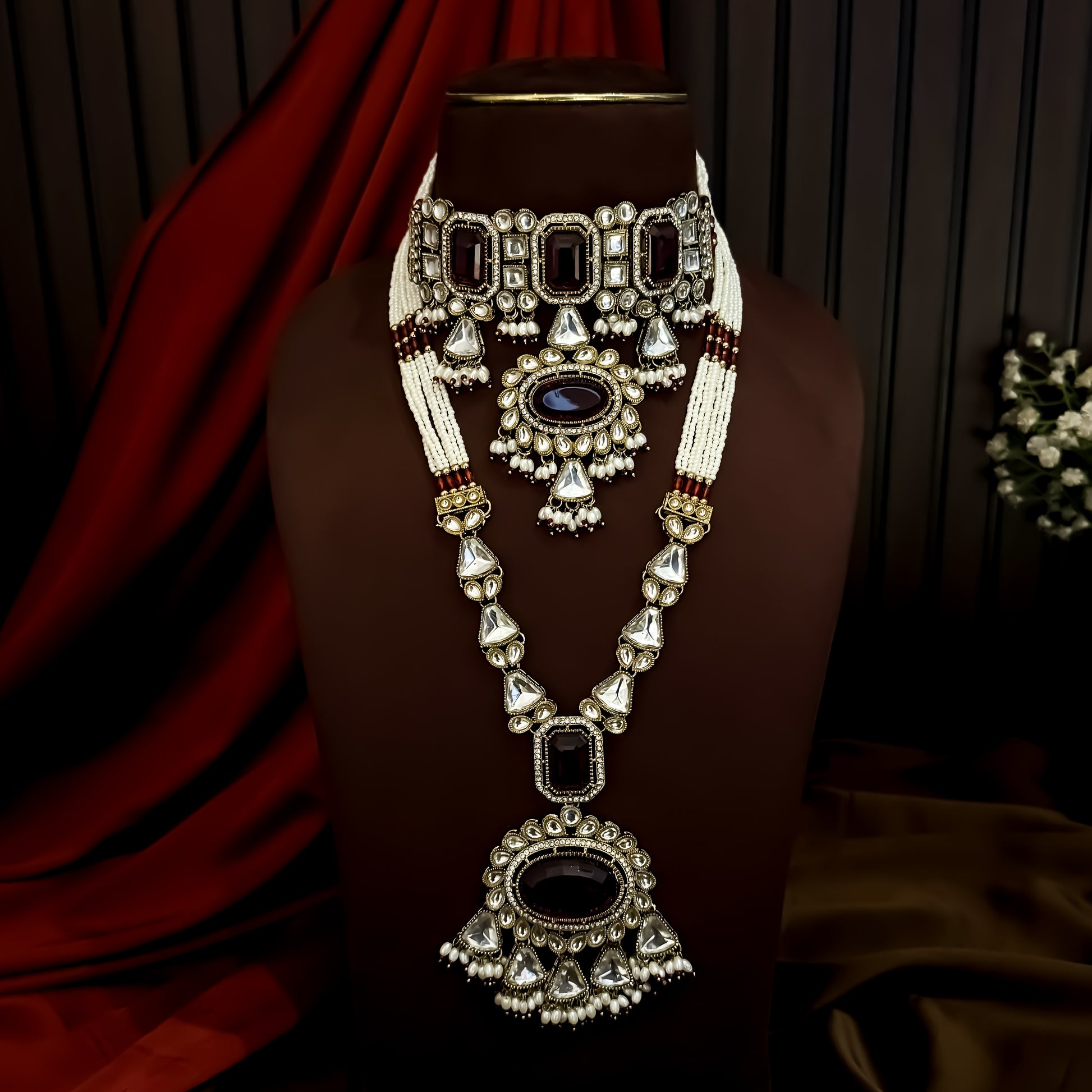 Israni Premium Kundan Long & Short Necklace Set - Maroon