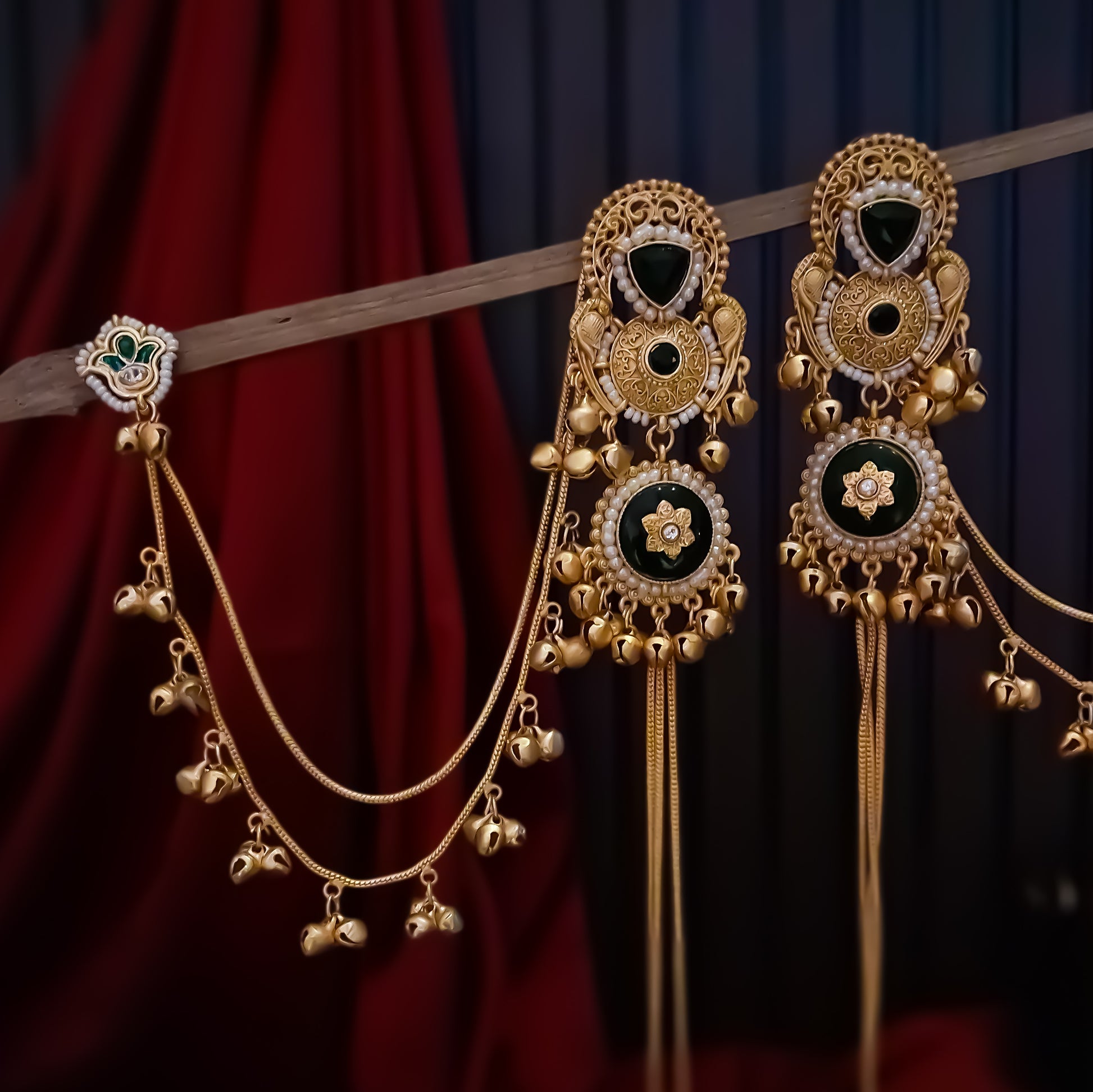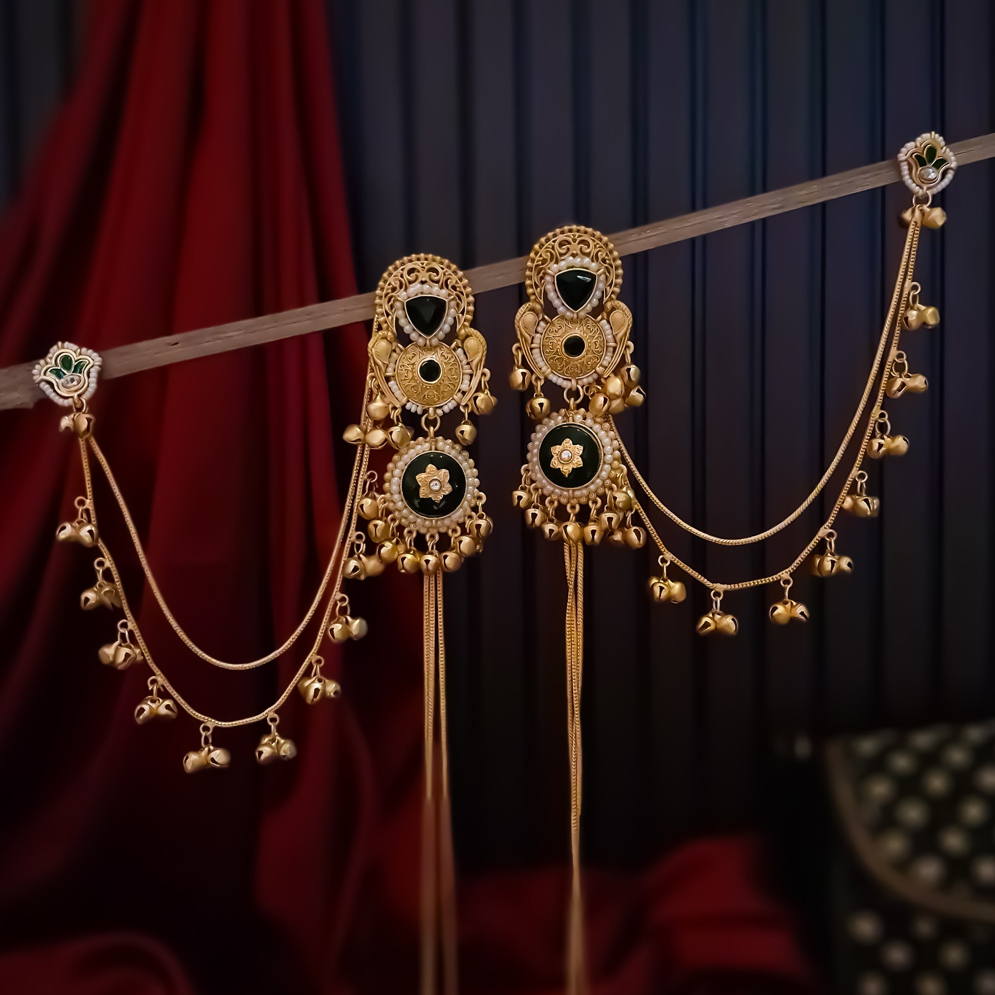 Chaya Premium Kashmiri Matte Polish Ghungroo Earrings - Ruby & Green
