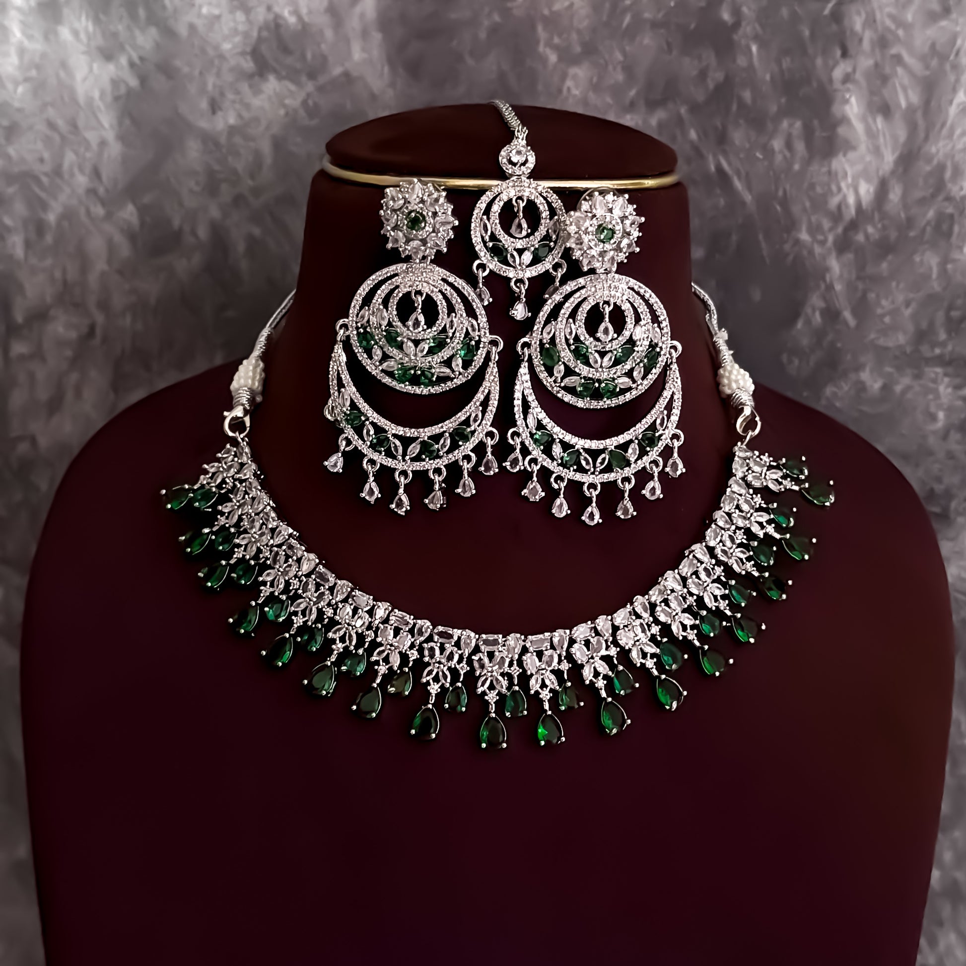 Jeniffer (American Diamond) AD Necklace Set with Teeka & Chandbali Earrings - Green