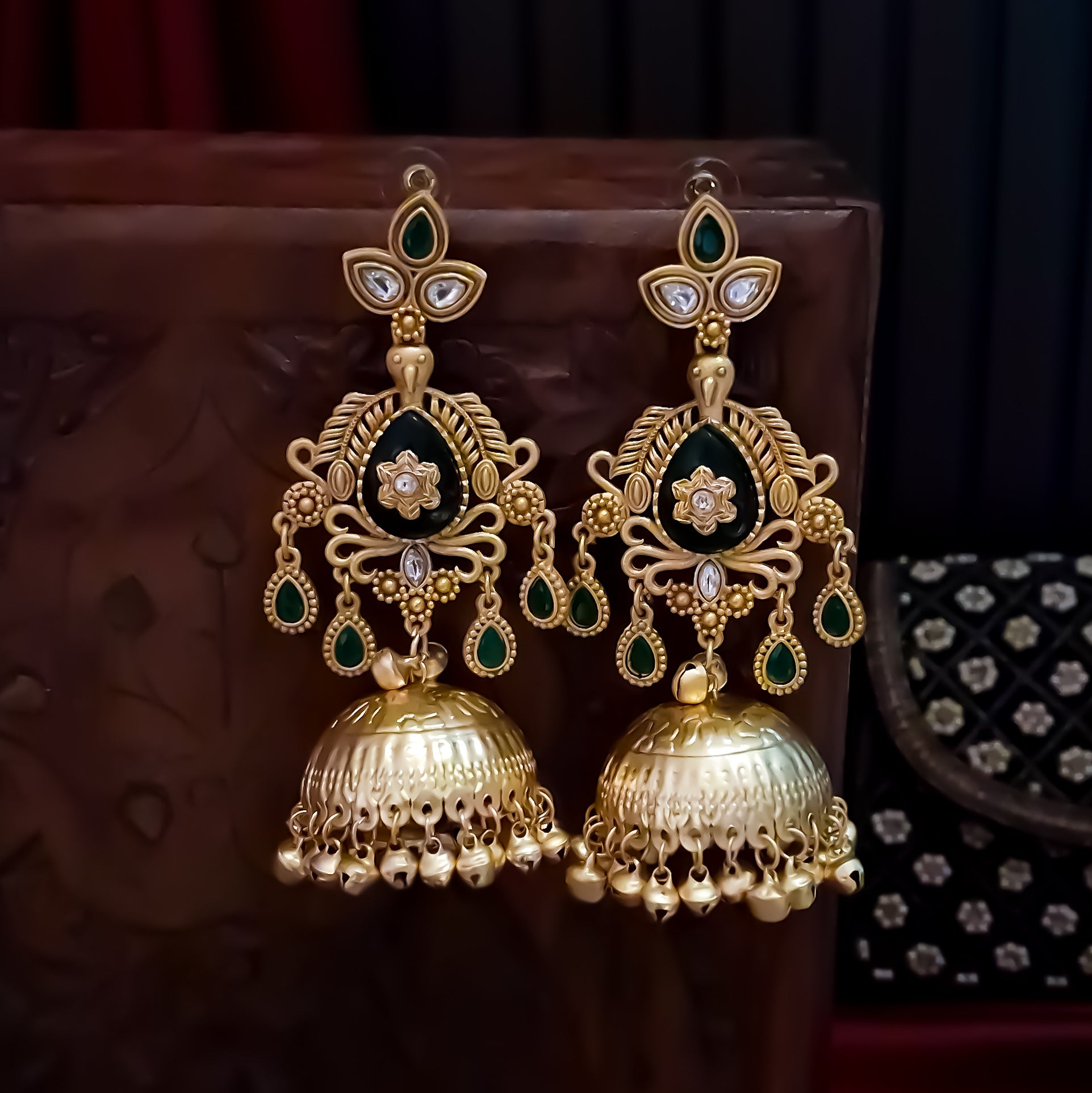 Jhanjar Premium Kashmiri Matte Polish Ghungroo Jhumka Earrings - Green