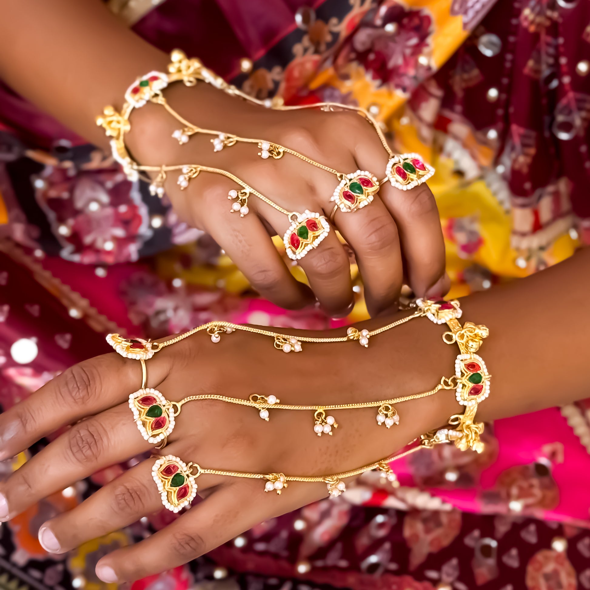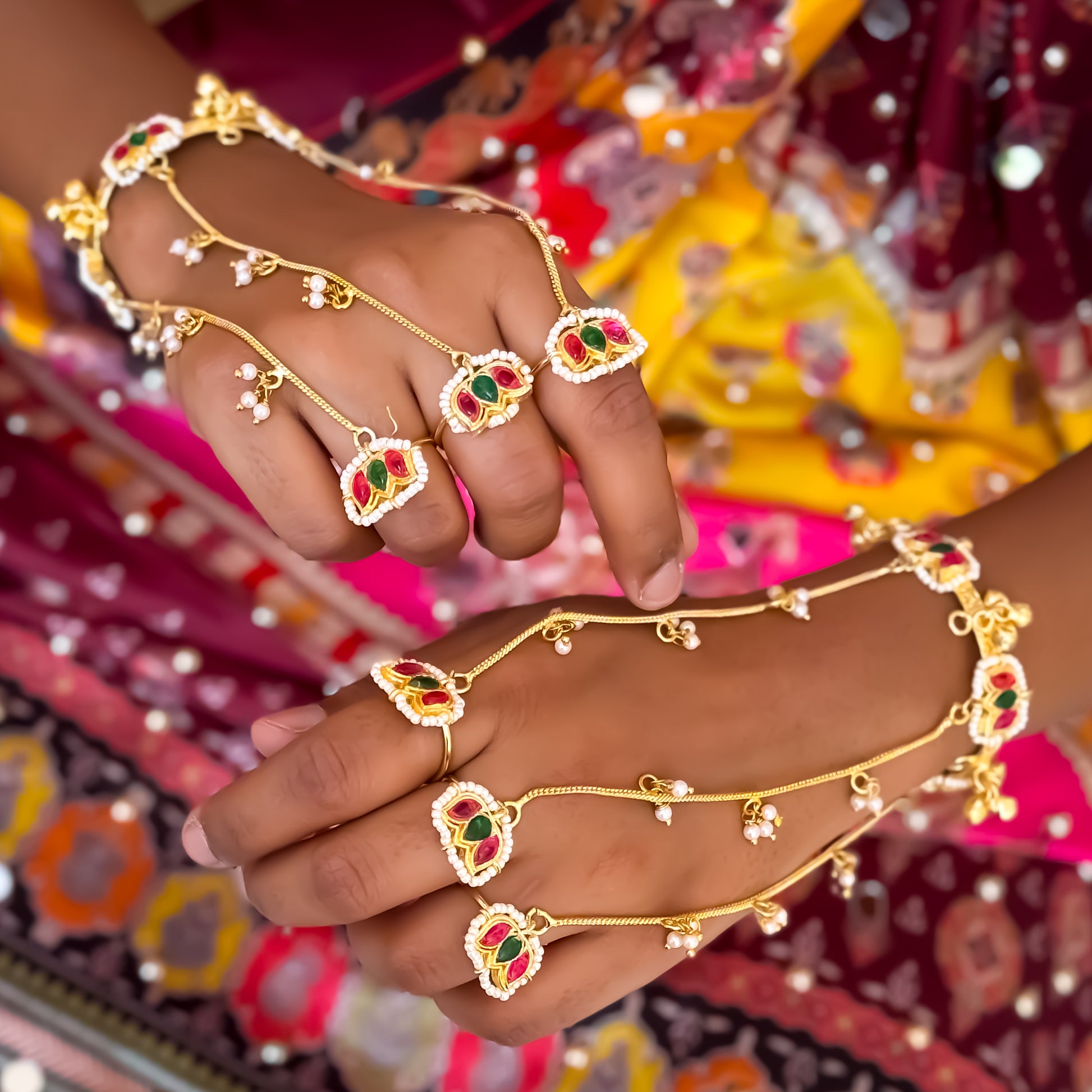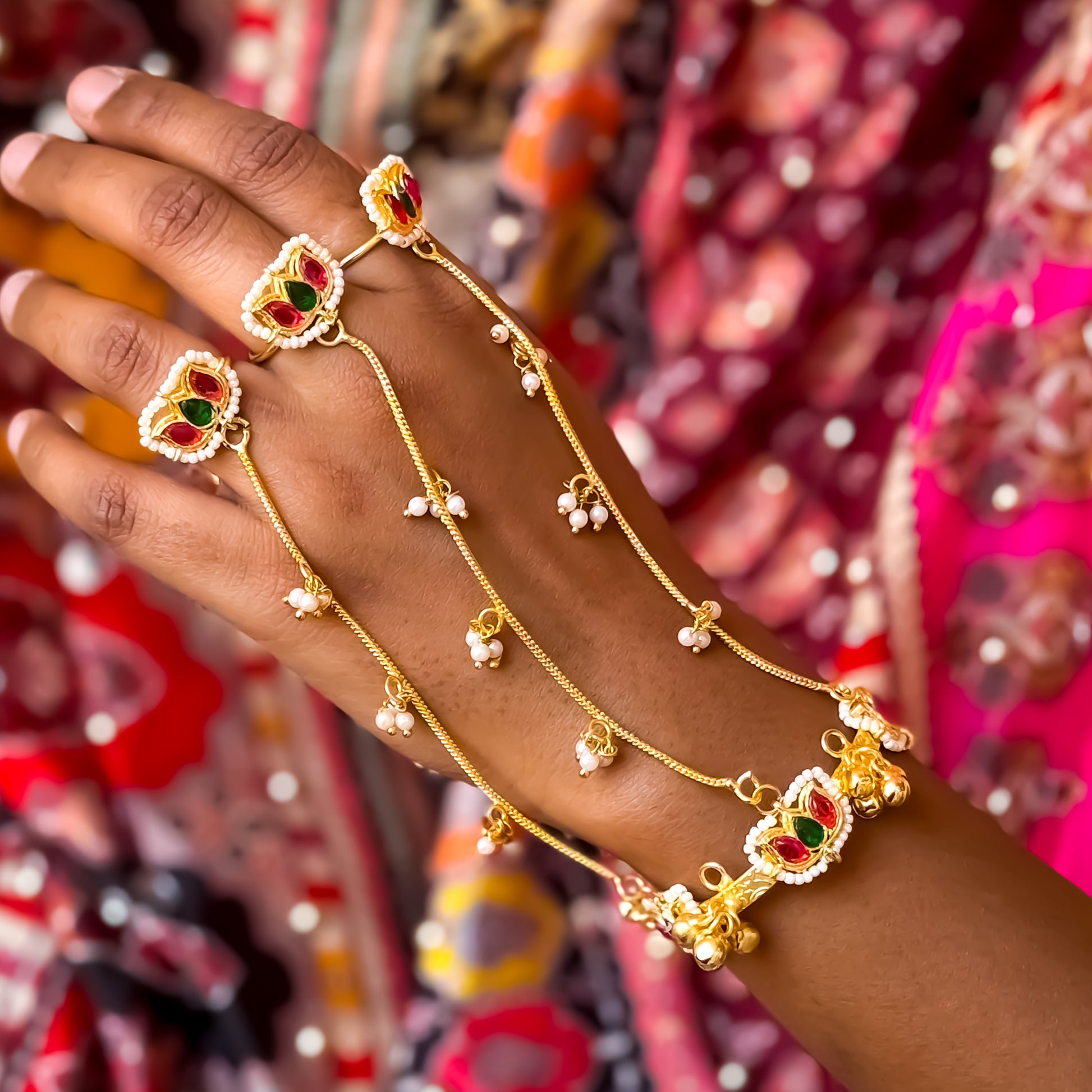 Designed with delicate ghungroos that create a subtle musical tinkle with every movement, it wraps gracefully around your wrist and fingersāmaking it the perfect statement accessory for weddings, sangeet, mehendi, and festive celebrations.
