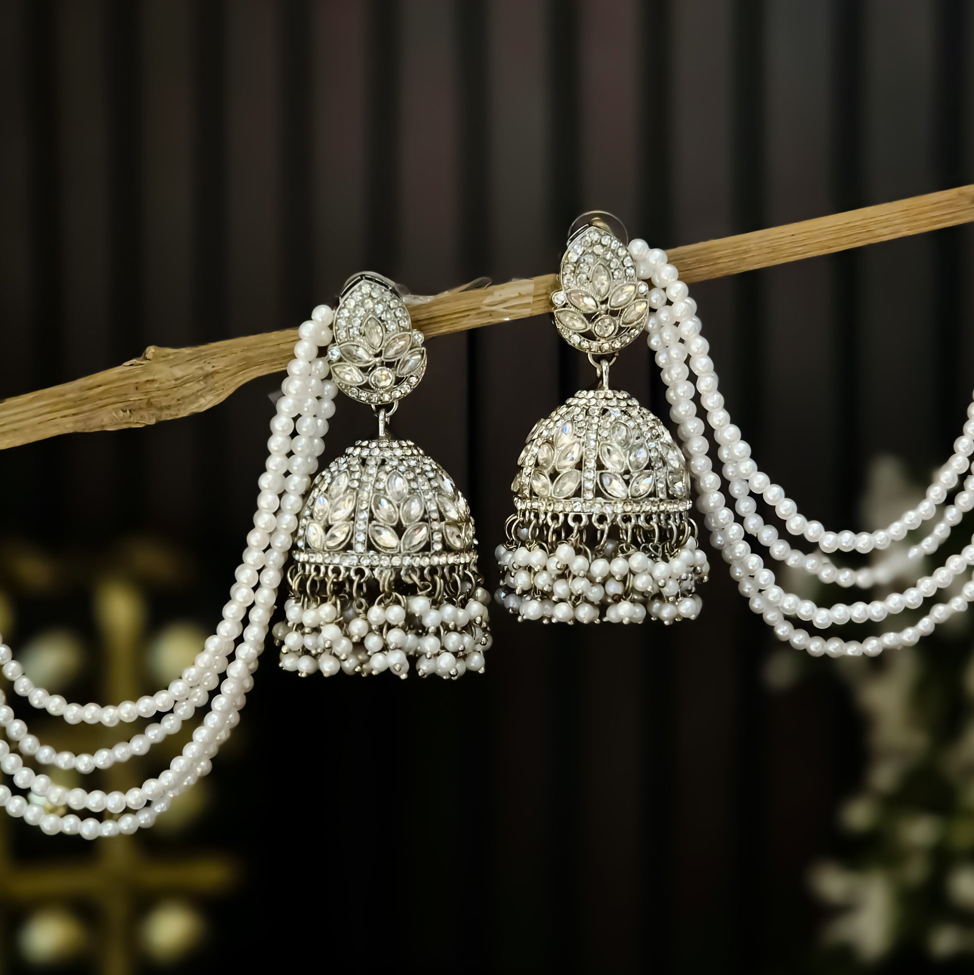 Sabrina Rhodium Reverse AD Jhumka Earrings with Earchain - Silver